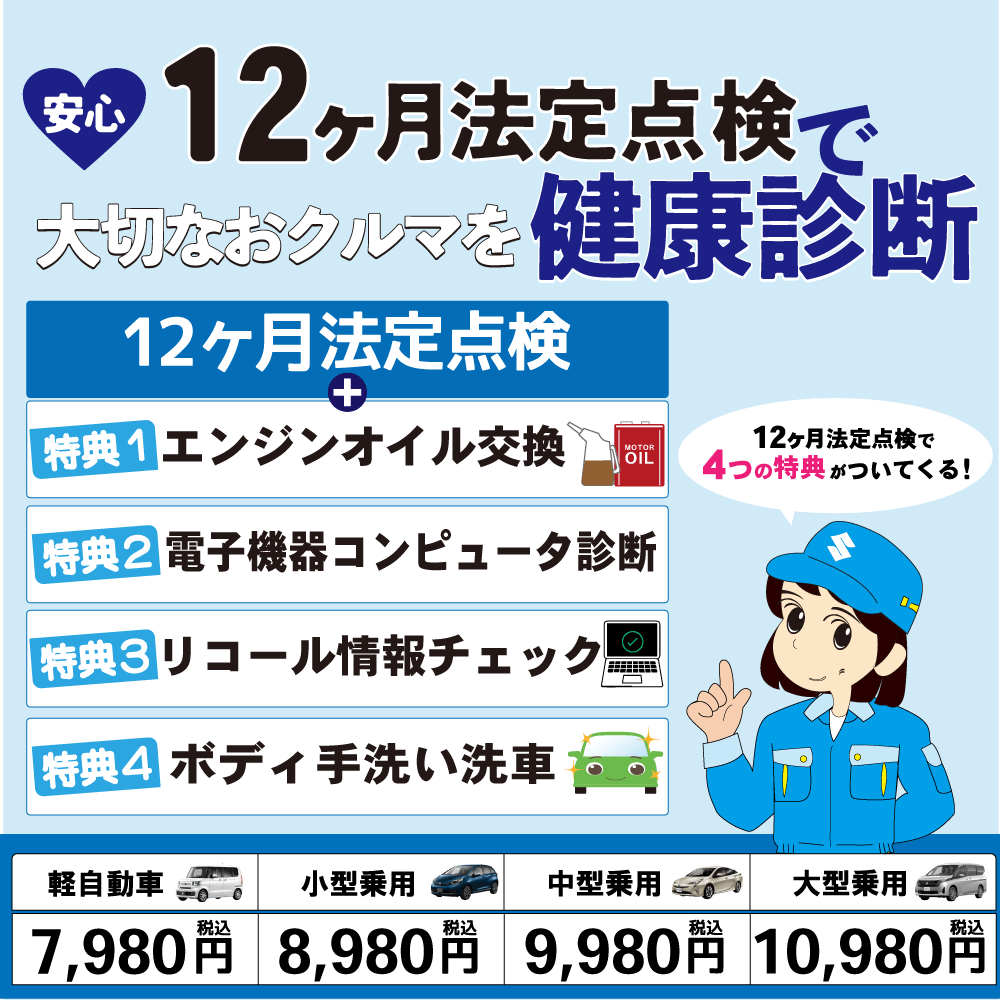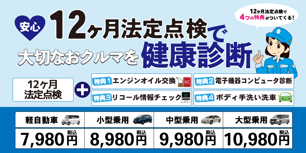 短時間で終わる立会い車検、朝出して夕方完成の1日車検、とってもお得な車検料金をチェックしてください。